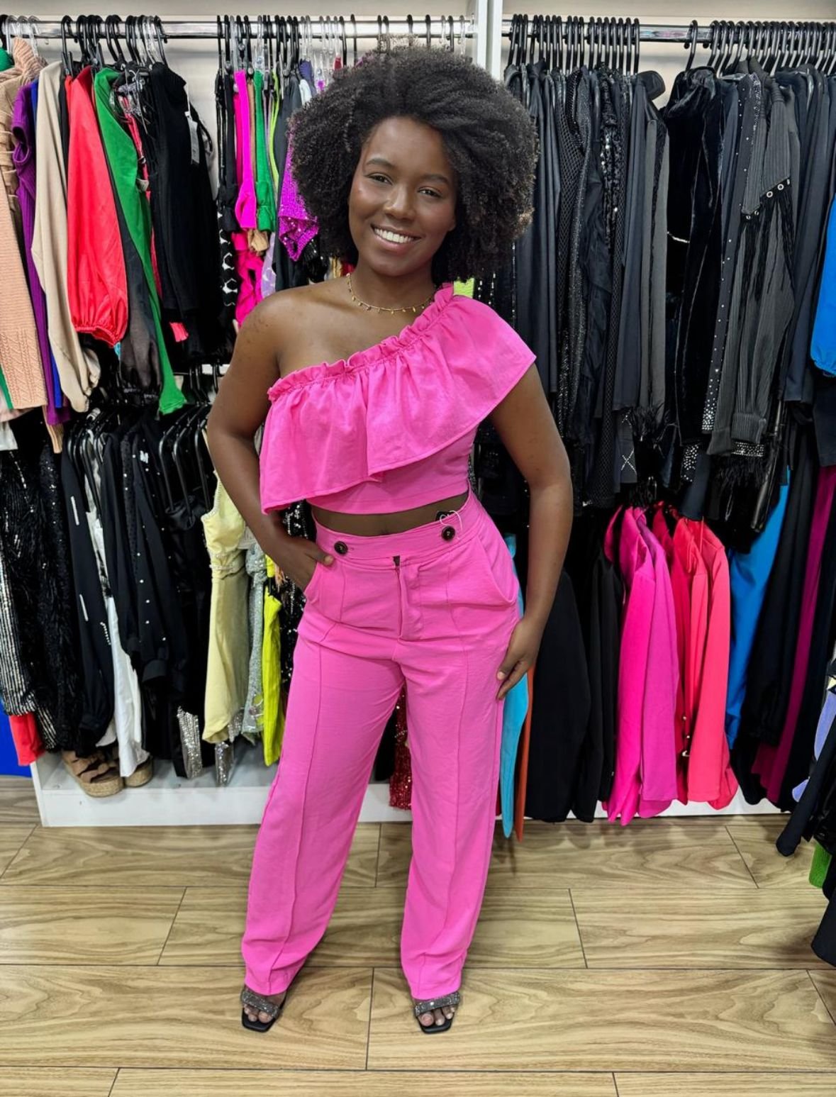 Conjunto Duna com calça e cropped ombro só – estilo e conforto em um look moderno e versátil para qualquer ocasião.